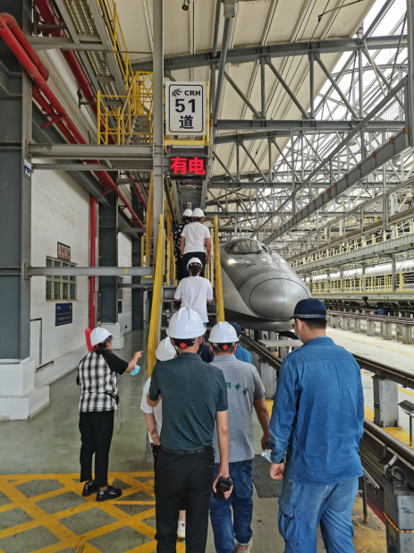 中午,参观完机务段后,全体员工赴昆明车辆段动车所,在观景台鸟瞰存车线上一列列整装待发的“高铁航母”动车组;通过参观动车组检修库,了解检修库三层作业平台的用途,观看动车内部设施;到高铁模型室观摩各个时期的精致火车模型,并亲身体验动车组仿真实训室动车模拟驾驶;到高地参观新华门的红墙、典型示范区、井冈山的学习区、西柏坡的座谈区、宝塔山的阅读区、警示教育区等展区,观看云南铁路发展史视频,听动车所工程师对动车发展史、动车型号区分、运行原理、安全知识等的生动讲解,最后参观象征云南铁路从米轨到高铁时代百年约定的106广场。